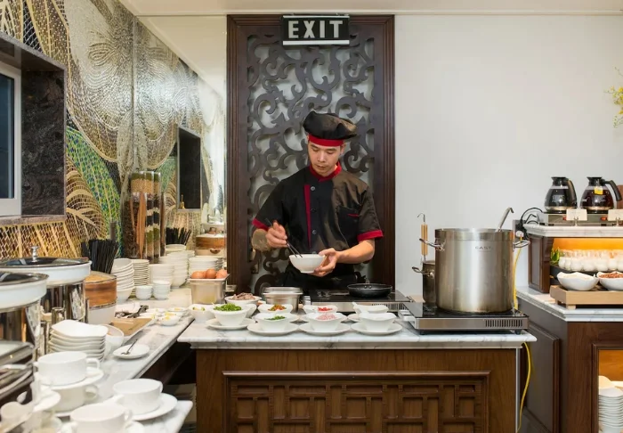 Begin de dag met het ontbijtbuffet van het hotel, waar lokale smaken samenkomen met internationale klassiekers. Kies uit versgebakken brood, seizoensfruit, eieren zoals u ze graag hebt, Vietnamese specialiteiten en een kop versgezette koffie voordat u eropuit trekt om de bezienswaardigheden van Hanoi te ontdekken. Later op de dag kunt u terecht bij Pal Bar & Restaurant, waar zowel Vietnamese gerechten als internationale favorieten worden geserveerd in een ontspannen sfeer. Neem plaats voor een heerlijke maaltijd of geniet simpelweg van een drankje.
