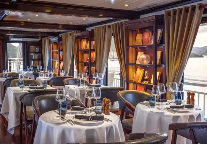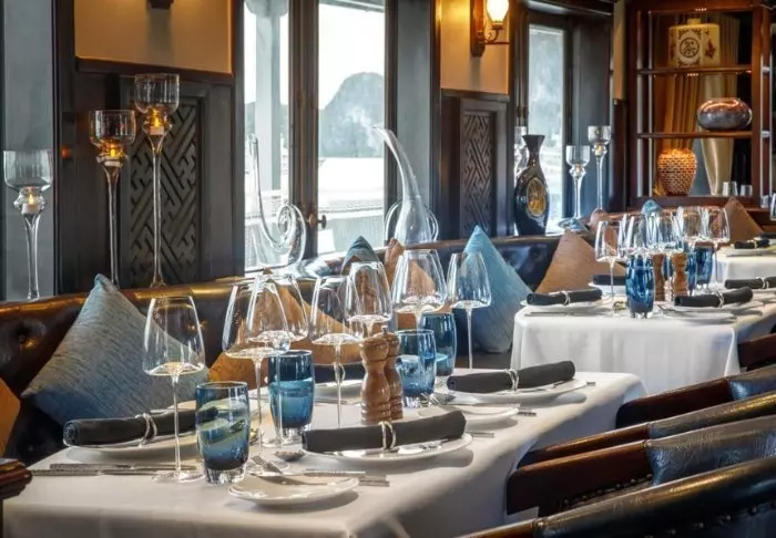 In het restaurant van het schip kunt u tijdens het eten van het uitzicht genieten. Er worden Aziatische en Europese gerechten geserveerd en ‘s avonds kunt u genieten van een goede selectie wijnen en cocktails, terwijl de zon achter de adembenemende kalksteenrotsen verdwijnt.