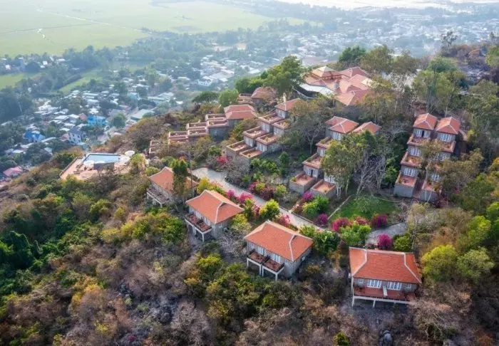 Een eindje de helling van Sam berg op ligt de Victoria Nui Sam Lodge. Deze ligging zorgt voor het prachtigste uitzicht op de Mekongdelta met groene rijstvelden, kanalen en bergen op de achtergrond richting de grens met Cambodja.