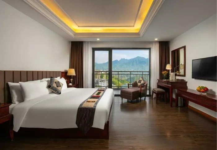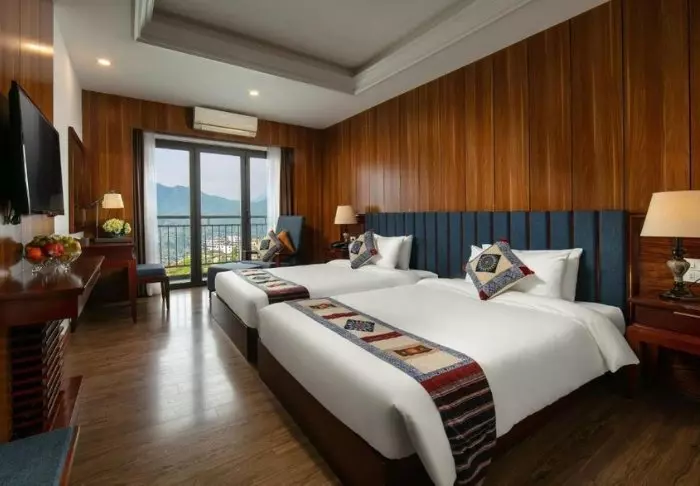 De 104 kamers van het hotel zijn ruim en elegant ingericht in traditionele Vietnamese stijl met donkere houten meubels. Hier is alles aanwezig voor een comfortabel verblijf, zoals wifi, airconditioning, een kluisje, een tv en een zithoek. De badkamer is voorzien van een douche en gratis toiletartikelen, een föhn, badjassen en badslippers. De meeste kamers hebben ook grote raampartijen die een schitterend uitzicht bieden op het schilderachtig landschap van Sapa.