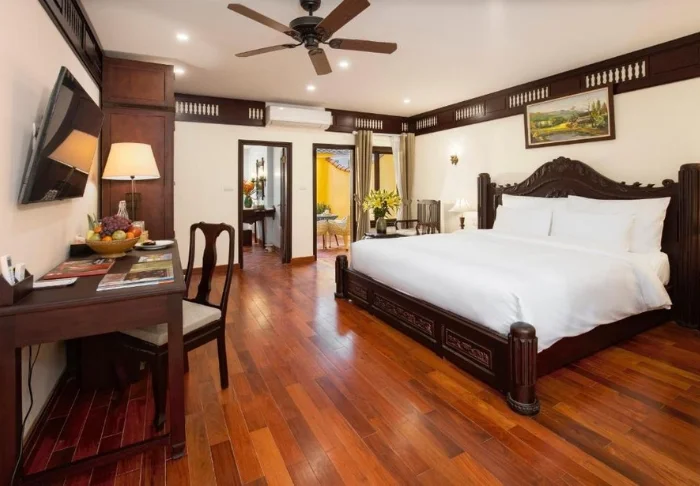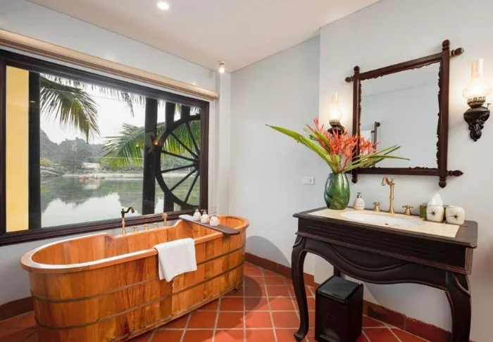 U verblijft doorgaans in een Superior-kamer van 36 m², ideaal voor twee personen. De kamers hebben houten vloeren, donkerhouten meubilair en lichte wanden, wat zorgt voor een rustige, ingetogen uitstraling. U kijkt uit op de Ngo Dong-rivier en de omgeving van het resort, en elke kamer heeft een eigen balkon of terras. Tot de voorzieningen behoren airconditioning en verduisteringsgordijnen, evenals een TV, wifi, telefoon, kluisje, koelkast en waterkoker voor thee en koffie. Er staan gratis flesjes mineraalwater voor u klaar. De badkamer is uitgerust met zowel een douche als een bad en beschikt verder over toiletartikelen, een badjas, slippers en een föhn.