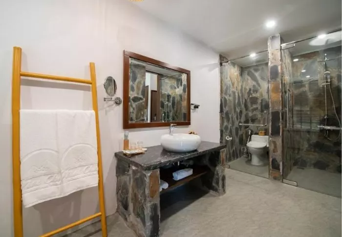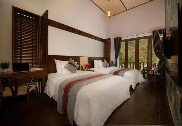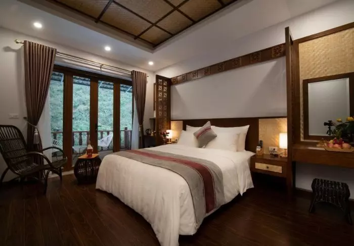 De kamers van Mai Chau Mountain View zijn smaakvol ingericht met lichte muren en mooie, donkere houten meubels die de Vietnamese esthetiek omarmen. Elke kamer is voorzien van wifi, airconditioning, kluisje, minibar, tv, telefoon en waterkoker, zodat u zelf een kopje thee of koffie kunt zetten. De badkamer is voorzien van toiletartikelen, föhn, badjassen en slippers. Vanaf uw balkon of terras kunt u genieten van het prachtige uitzicht op de omliggende rijstvelden en bergen.
