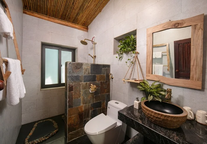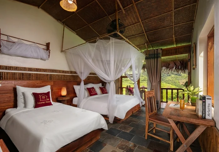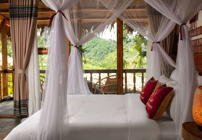 U verblijft standaard in een 32 m2 Deluxe Valley View-kamer met uitzicht op enkele van de mooiste rijstterrassen van de omgeving. De kamer is gebouwd van hout en bamboe, met wanden en plafonds van natuurlijke materialen die de traditionele bouwstijl van Pu Luong weerspiegelen. De gordijnen zijn versierd met geborduurde details die met de hand zijn genaaid door lokale Thaise vrouwen, wat zorgt voor een warme en persoonlijke uitstraling. De kamer beschikt over een kingsize bed en een extra bed, geschikt voor twee volwassenen en één kind. Vanaf het balkon geniet u van de ochtendzon met een kop Vietnamese koffie terwijl het dal langzaam tot leven komt. Verder is de kamer uitgerust met airconditioning, een minibar, een waterkoker en een badkamer met douche en warm water.