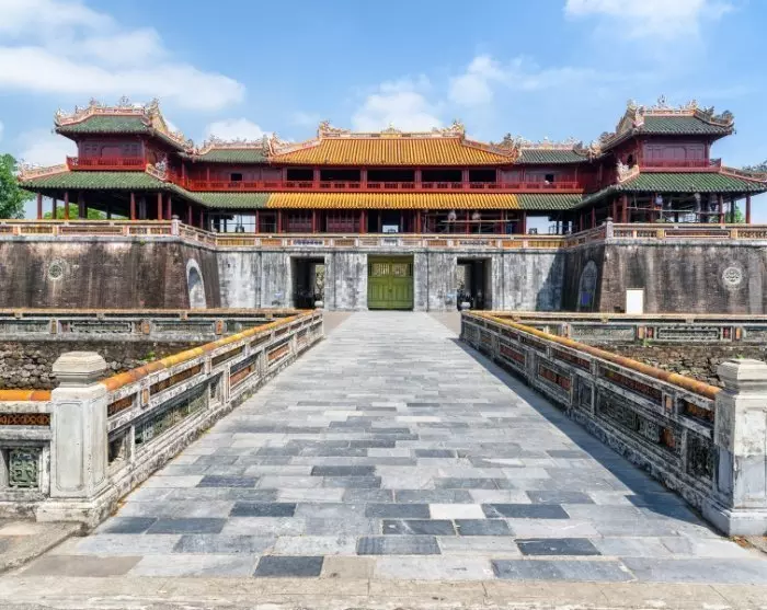 De reis gaat vervolgens verder naar het afgelegen An Dinh paleis. Gebouwd aan het begin van de 20e eeuw als residentie voor de keizerlijke familie, combineert het paleis Vietnamese keizerlijke architectuur met elegante Europese elementen. Binnen kunt u indrukwekkende muurschilderingen, gouden ornamenten en weelderige details bewonderen, terwijl de omliggende tuinen rust en grandeur uitstralen.