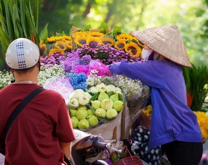 U vervolgt uw weg door de drukke straat Hoang Hoa Tham vol bloemenwinkels en lokale handelaars. Geniet van de betoverende geuren van de seizoensbloemen en de aanblik van de fijne bonsaiboompjes.