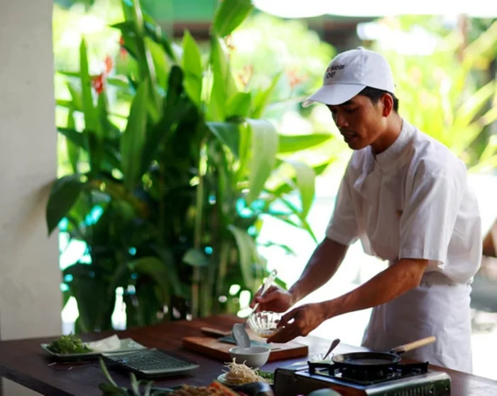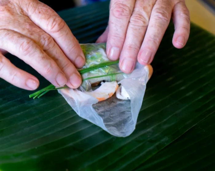 Na ongeveer 25 minuten komt u aan bij de Red Bridge Cooking School. Hier krijgt u eerst een korte rondleiding door de weelderige kruidentuin, waarna u uw schort aantrekt en de keuken in duikt. De kookles zelf duurt ongeveer twee uur en vindt plaats in een ontspannen, maar leerzame sfeer. Eerst laten de chefs zien hoe iedere gang bereid wordt; daarna mag u zelf aan de slag.