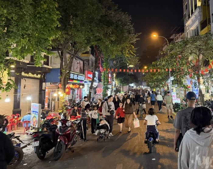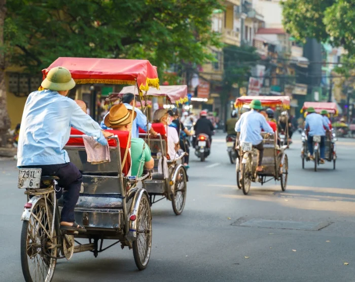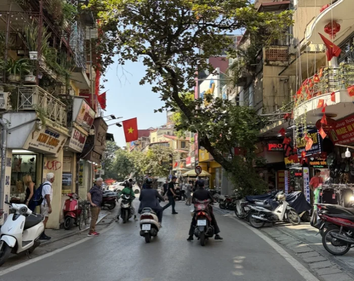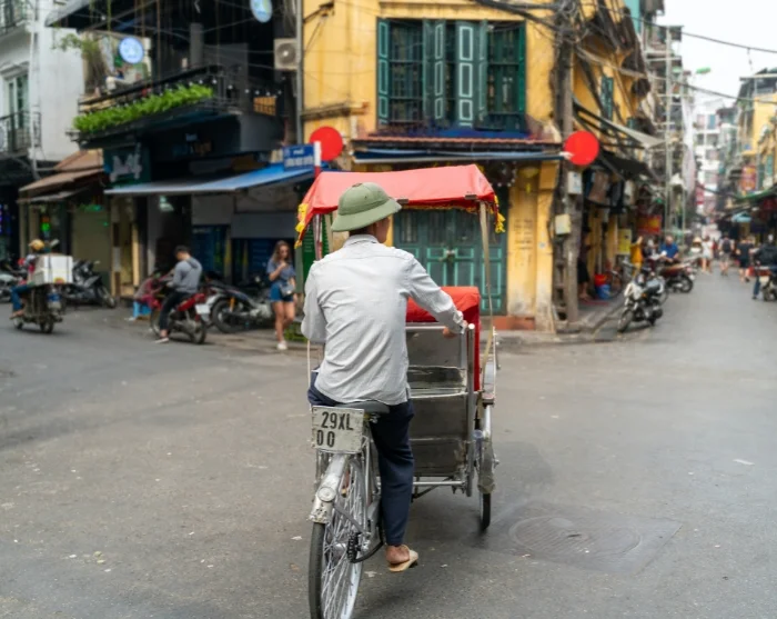 De reis gaat verder in een traditionele fietsriksja – ook wel cyclo genoemd – door het doolhof van smalle straatjes en bruisend marktleven in de Oude Wijk van Hanoi. Deze wijk staat bekend om zijn 36 straatjes, die oorspronkelijk vernoemd waren naar de goederen die er werden verkocht, zoals bamboe, zijde, papier en tin. Veel straatnamen zijn nog altijd hetzelfde gebleven en de sfeer ademt nog steeds lokale charme, terwijl de inwoners van Hanoi handelen, kletsen en dampende kommen pho serveren vanuit hun straatkeukens.