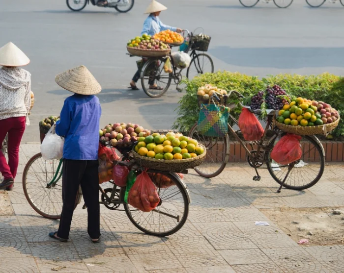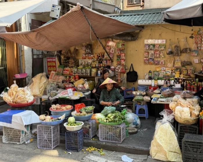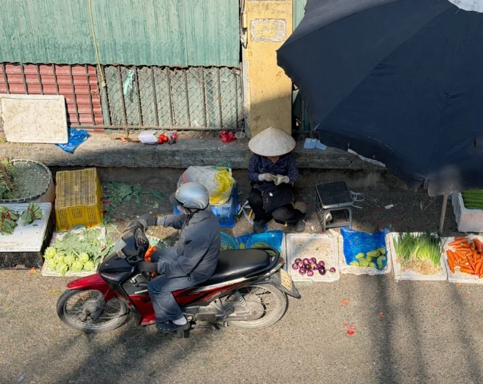 Vanaf hier kunt u verdergaan naar de omgeving van de Long Bien-brug en de nabijgelegen Long Bien-markt, waar de handel in fruit, groenten en bloemen zich uitstrekt tot op straat. Het is een kleurrijk tafereel dat een levendig inkijkje biedt in het dagelijks leven van de stad. De sfeer is authentiek en het ritme bruisend, ongeacht het tijdstip van de dag.