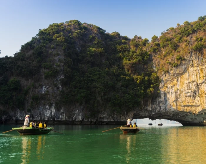 In de namiddag bezoekt u de Donkere en Heldere Grot, gelegen op het punt waar de Lan Habaai overgaat in de Ha Longbaai. De Donkere Grot is smal, diep en deels onder water, waardoor deze alleen van buitenaf te bekijken is. De Heldere Grot daarentegen is breder – ongeveer 3 meter hoog, 4 meter breed en zo’n 100 meter lang. U vaart met een kleine bamboeboot door de grot, die uitkomt in een serene, met licht gevulde lagune, omringd door kalkstenen kliffen en rijk begroeide hellingen.