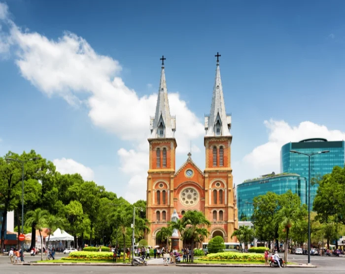 Recht tegenover het oude postkantoor staat de iconische Notre Dame-kathedraal, gebouwd tussen 1863 en 1880. Deze indrukwekkende kathedraal is een overblijfsel uit de Franse koloniale tijd en valt op door haar karakteristieke rode bakstenen en hoge torenspitsen.