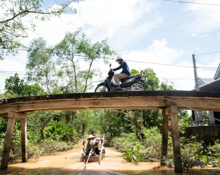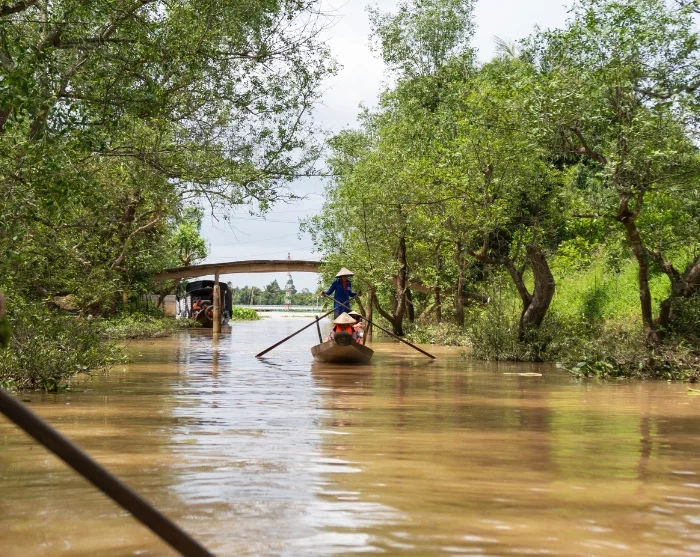 Net buiten Ho Chi Minhstad verandert het landschap al snel. Onderweg rijdt u langs groene velden en steekt u kleine rivieren en kanalen over die zich door het vlakke landschap slingeren. Het is heel gewoon om lokale boeren hun gewassen te zien verzorgen, terwijl waterbuffels langs de weg grazen en kleine kraampjes u verleiden met vers fruit.