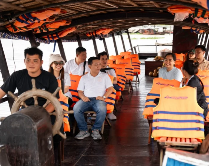 De boottocht brengt u naar een rustig eiland midden in de Mekongrivier, waar u geniet van een traditionele Vietnamese lunch, bereid met verse, lokale ingrediënten. U zit er omringd door een groene oase terwijl u het langzame ritme van het leven op de rivier ervaart.