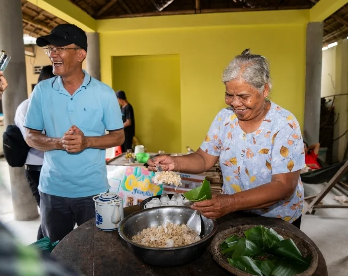 Uw tuk-tuk rijdt u over de rustige weggetjes van het dorp. De eerste stop is bij een lokaal gezin thuis, waar u com dep (groene rijstvlokken) proeft en ziet hoe gepofte rijst wordt gemaakt.