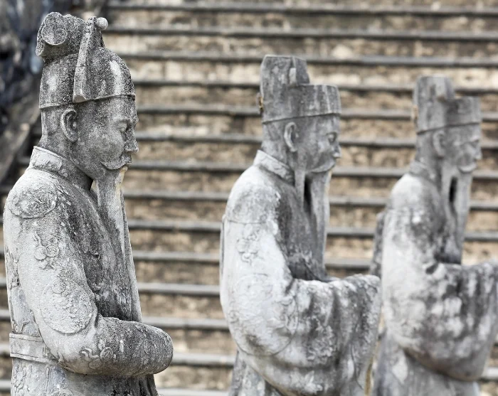 De reis vervolgt naar het mausoleum van keizer Khai Dinh, dat zich duidelijk onderscheidt van de andere keizerlijke graven in de omgeving. Deze tombe, gebouwd aan het begin van de 20e eeuw, is een unieke combinatie van Vietnamese traditie en Europese barokke en gotische invloeden. Het resultaat is een bijzonder en rijkelijk versierd bouwwerk dat zowel een eerbetoon is aan de overleden keizer, als een weerspiegeling van zijn fascinatie voor westerse kunst en cultuur.