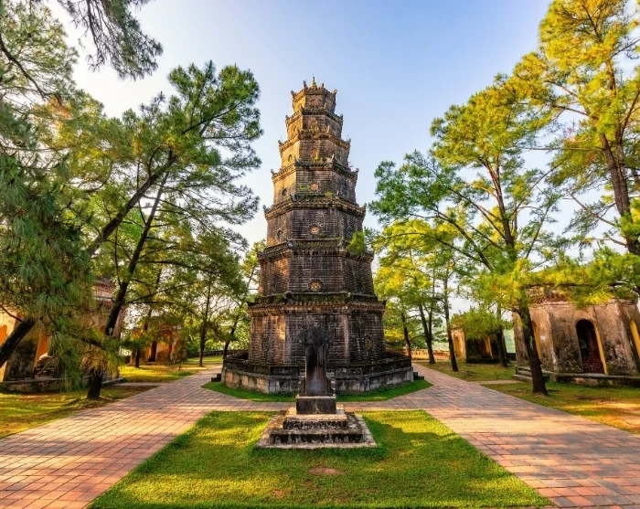 Vervolgens bezoekt u de Thien Mu Pagode, het oudste en meest iconische religieuze monument van Hué. Deze pagode, die hoog boven de Parfumrivier uittorent, is al meer dan 400 jaar een belangrijk boeddhistisch centrum in Centraal-Vietnam. De achthoekige toren rijst statig omhoog en vormt een serene plek voor zowel het tempelcomplex als de monnikengemeenschap die hier nog altijd woont en praktiseert.