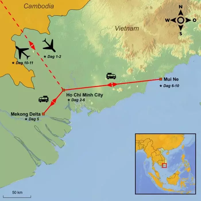 Uw reis eindigt in Mui Ne aan de zuidkust van Vietnam, waar u heerlijk tot rust komt op de uitgestrekte zandstranden. Geniet van de serene sfeer en prachtige zeezichten, proef de overheerlijke Vietnamese keuken of ga op pad langs de zandduinen en sfeervolle vissersdorpjes in de omgeving.