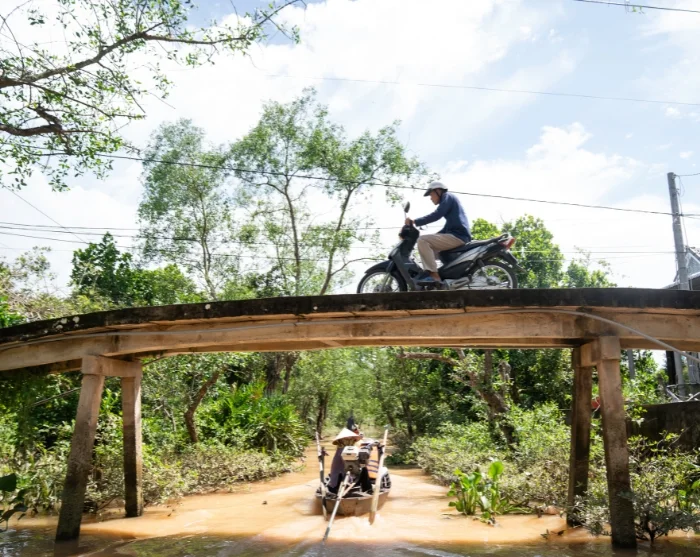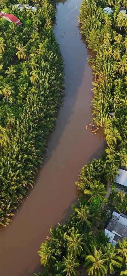 Niet lang nadat u Ho Chi Minhstad heeft verlaten, merkt u dat het landschap begint te veranderen. Onderweg passeert u uitgestrekte groene rijstvelden en slingert u langs kleine riviertjes en kanalen die door het vlakke land kronkelen. U ziet vaak lokale boeren hun gewassen verzorgen terwijl waterbuffels langs de weg grazen, en kleine stalletjes aan de kant van de weg waar u wordt verleid met vers fruit.