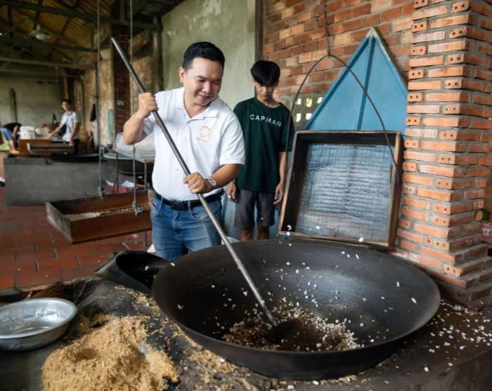 Vervolgens rijdt de tuk-tuk over de rustige wegen van het dorp. De eerste stop is bij een lokale familie thuis, waar u kunt proeven van com dep (groene rijstvlokken) en kunt zien hoe gepofte rijst wordt gemaakt.