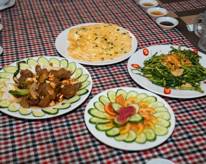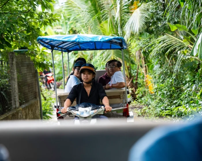 De boottocht brengt u naar een rustig eiland midden in de Mekongrivier, waar u geniet van een Vietnamese lunch, bereid met verse lokale ingrediënten, omgeven door groen en het rustgevende ritme van het leven aan de rivier.