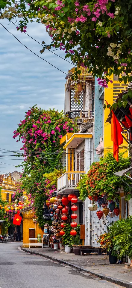 Wanneer u zich verwijdert van de rivier ontdekt u een doolhof van sfeervolle, smalle straatjes. Hier staat u oog in oog met een kleurrijke mix van Japanse houten huizen, Chinese vergaderzalen, Franse koloniale panden en karakteristieke koopmanshuizen. Boven de straten hangen vrolijk gekleurde lantaarns als slingers en zorgen voor een magische sfeer—vooral als de avond valt. Winkeltjes, streetfood-kraampjes, cafés en kleine restaurants liggen verspreid als kralen aan een ketting en nodigen u uit om te ontspannen, rond te kijken en helemaal op te gaan in de unieke sfeer van deze plek.
