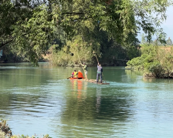 Daarna bereikt u een rustige rivier, waar een ontspannen boottocht op een traditionele bamboevlot op u wacht. U krijgt een reddingsvest, en terwijl het vlot langzaam stroomopwaarts drijft, kunt u, als u wilt, zelf een handje helpen met peddelen.