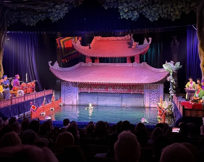 Sluit de dag af met een voorstelling in een waterpoppentheater, een eeuwenoude Vietnamese traditie waarbij poppen op het wateroppervlak dansen, begeleid door livemuziek en klassieke vertellingen.
