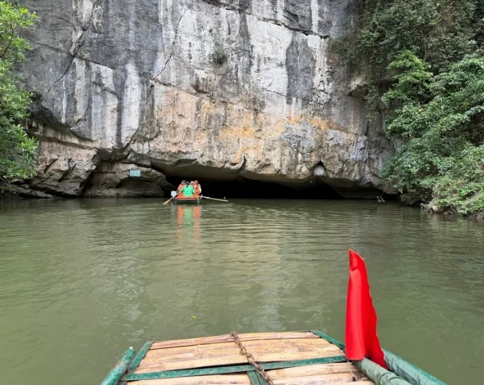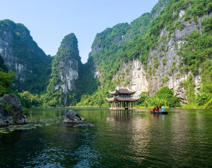 Daarna fietst u terug naar het startpunt. Dat is maar een paar minuten fietsen. Hier levert u de fiets in, waarna u naar de Trang An-grotten wordt gebracht, een spectaculair natuurgebied met imposante rotsformaties en verborgen grotten. U stapt aan boord van een traditionele sampan en glijdt in stilte over de kalme rivier door een netwerk van grotten, waaronder Lam Cave, Vang Cave, Dai Cave en Thanh Truot Cave. Onderweg passeert u ook de tempels van Cao Son, Suoi Tien en Vu Lam, evenals Skull Island, dat diende als filmlocatie voor de film uit 2017 “Kong: Skull Island”.