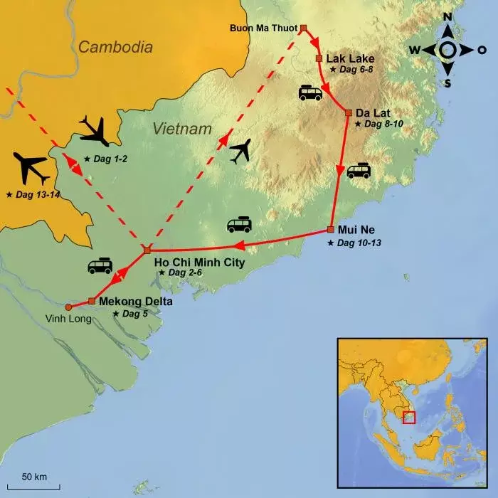 De dag is naar eigen wens in te vullen tot u in de middag wordt opgehaald bij uw hotel en naar de internationale luchthaven Tan Son Nhat in Ho Chi Minhstad wordt gebracht. Vanaf hier vliegt u naar Buon Ma Thuot, gelegen in de centrale hooglanden van Vietnam, zo’n 350 km ten noordoosten van Ho Chi Minhstad. De vlucht duurt ongeveer 1 uur.
