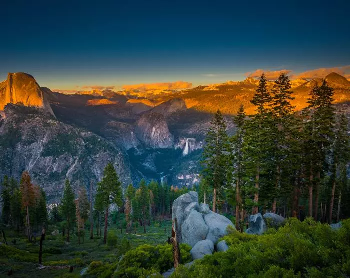 In de zomer moet u het populaire uitkijkpunt Glacier Point bezoeken, vanwaar u kunt genieten van een panoramisch uitzicht op de bergen en watervallen van het park. Het is een goed idee om hier vóór zonsondergang heen te gaan om te zien hoe de enorme rots, Half Dome, rood wordt gekleurd door de zon. Kort na zonsondergang wordt u hier bovendien, op 2200 meter hoogte, beloond met een sterrenhemel die zich openbaart net boven uw hoofd, zo lijkt het tenminste. Gaat u overdag naar boven met een enkeltje voor de bus (te boeken in het Visitor Center) dan kunt u de prachtige Four-Mile-Trail lopen, die u weer naar beneden voert.