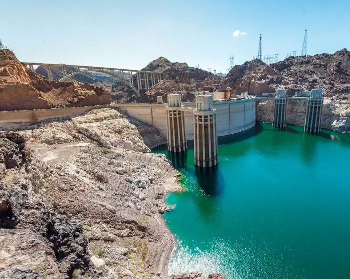 Ongeveer 3 kwartier voordat u Las Vegas bereikt, moet u een omweg maken naar de enorme Hoover Dam. De dam, die de Colorado-rivier doorsnijdt, is een indrukwekkende constructie met een hoogte van maar liefst 221 meter en een lengte van 379 meter. De dam ligt precies op de grens van de twee staten Arizona en Nevada, die een tijdsverschil van 1 uur hebben, wat ter plekke wordt getoond met een reusachtige klok.