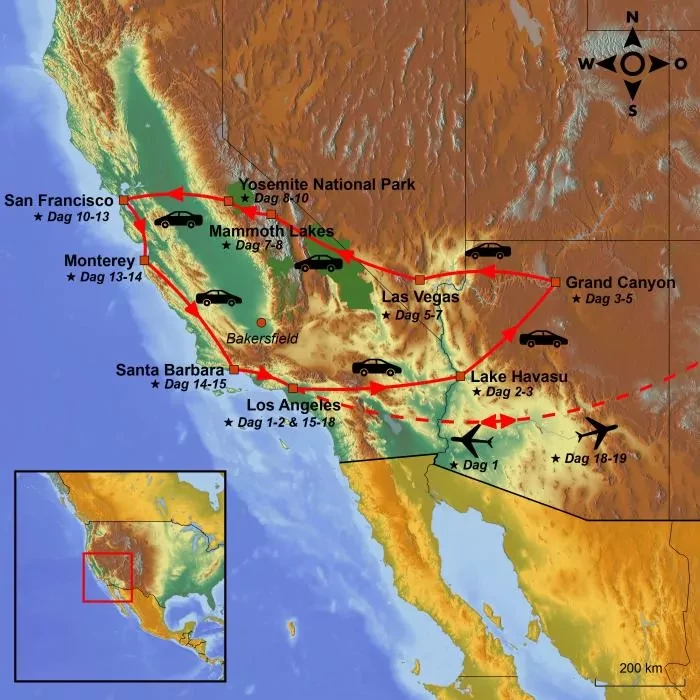 Let op: de route van Mammoth Lakes naar het Yosemite National Park is het kortst in de zomermaanden, als de sneeuw uit de bergen gesmolten is. Als de sneeuw weg is, is het mogelijk om over de bergpas, Tioga Pass, te rijden, die meestal van juni-oktober open is. Reis je in maanden waarin de bergpas normaal gesproken gesloten is, dan wordt je overnachting automatisch gewijzigd naar Bakersfield, zodat je ten zuiden van de Sierra Nevada rijdt.