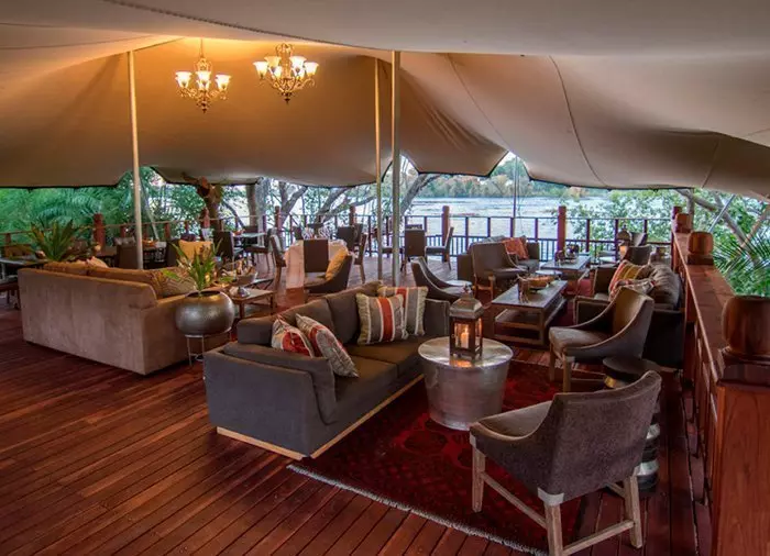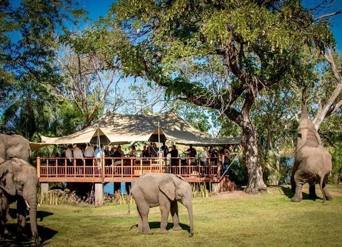 Naast de voederplaats van de olifanten, waar een fenomenaal uitzicht op de rivier de Zambezi is, is een café gebouwd. Hier wordt de lunch geserveerd (bij de prijs inbegrepen). En die mag er wezen! Bij het bereiden van het eten worden producten uit het omliggende gebied gekozen: fruit, kruiden, noten, wilde bloemen enz. Uiteraard bepaalt het seizoen de keuze. Een aantal ingrediënten is ook het lievelingseten van de olifanten. De koks hier kunnen echt toveren en het eten smaakt hemels! Het menu bestaat uit drie gerechten, inclusief wijn. Dit alles is bij de prijs inbegrepen.
