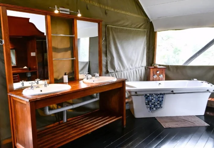U logeert in een elegante safaritent die stevige gemetselde wanden combineert met een canvasdak, wat een knusse maar rustieke sfeer creëert, terwijl grote ramen het licht en de wildernis naar binnen laten stromen. Alle tenten zijn ruim en voorzien van moderne gemakken, en elke tent heeft een privéveranda waar u in alle rust kunt genieten van het uitzicht en de geluiden van de bush.