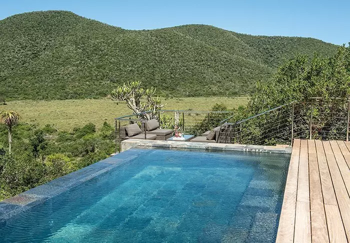 De lodge is op een helling in een afgelegen deel van het wildreservaat gebouwd, wat voor rust en een ongehinderd uitzicht op de natuur zorgt.