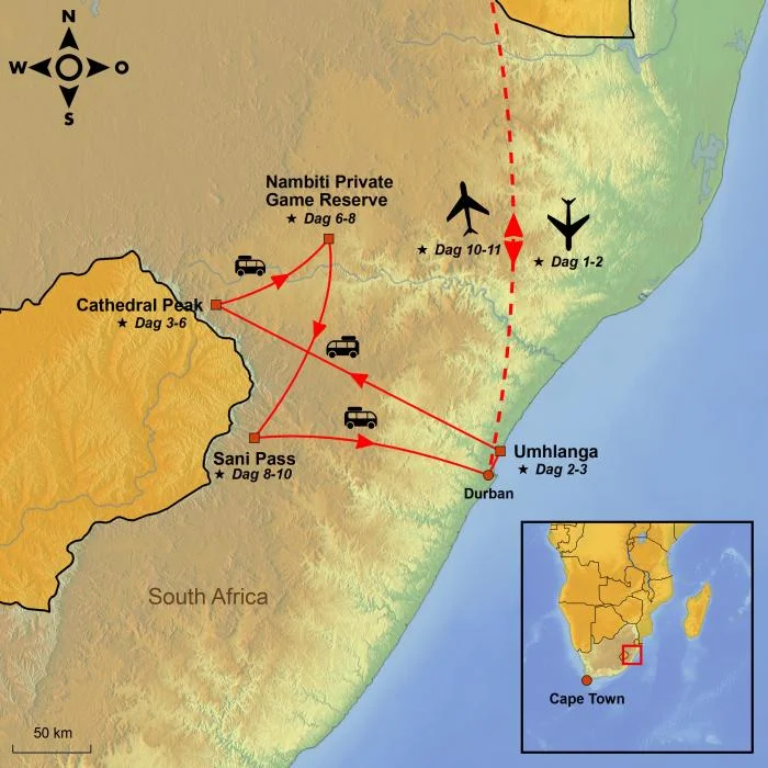 Vandaag vertrekt u vanaf de door u geselecteerde luchthaven, met tussenlanding(en) onderweg. U reist naar de provincie KwaZulu-Natal in Zuid-Afrika.