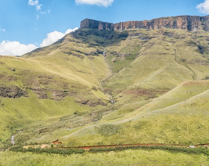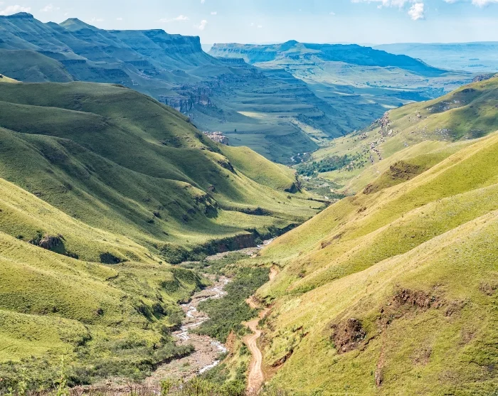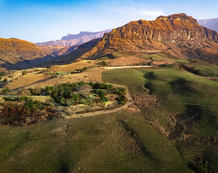 Vanuit Nambiti rijdt u zuidwaarts. Al snel laat u de savanne van het reservaat achter u en wordt u weer omringd door glooiende heuvels en groene weiden. Na een paar uur rijden (afhankelijk van het verkeer en hoeveel stops u onderweg maakt) verschijnen de grillige bergen langzaam weer aan de horizon.