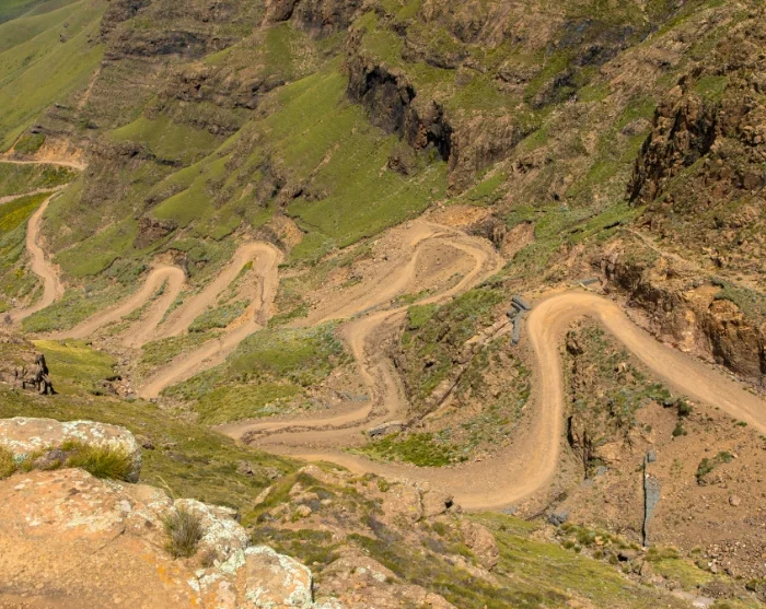 Aan het einde van de kronkelende weg ligt het Koninkrijk Lesotho. Vanaf de grens heeft u aan beide kanten uitzicht over het omliggende bergland, en het weer kan hier snel omslaan – van zon en helder zicht naar mist of een frisse wind.